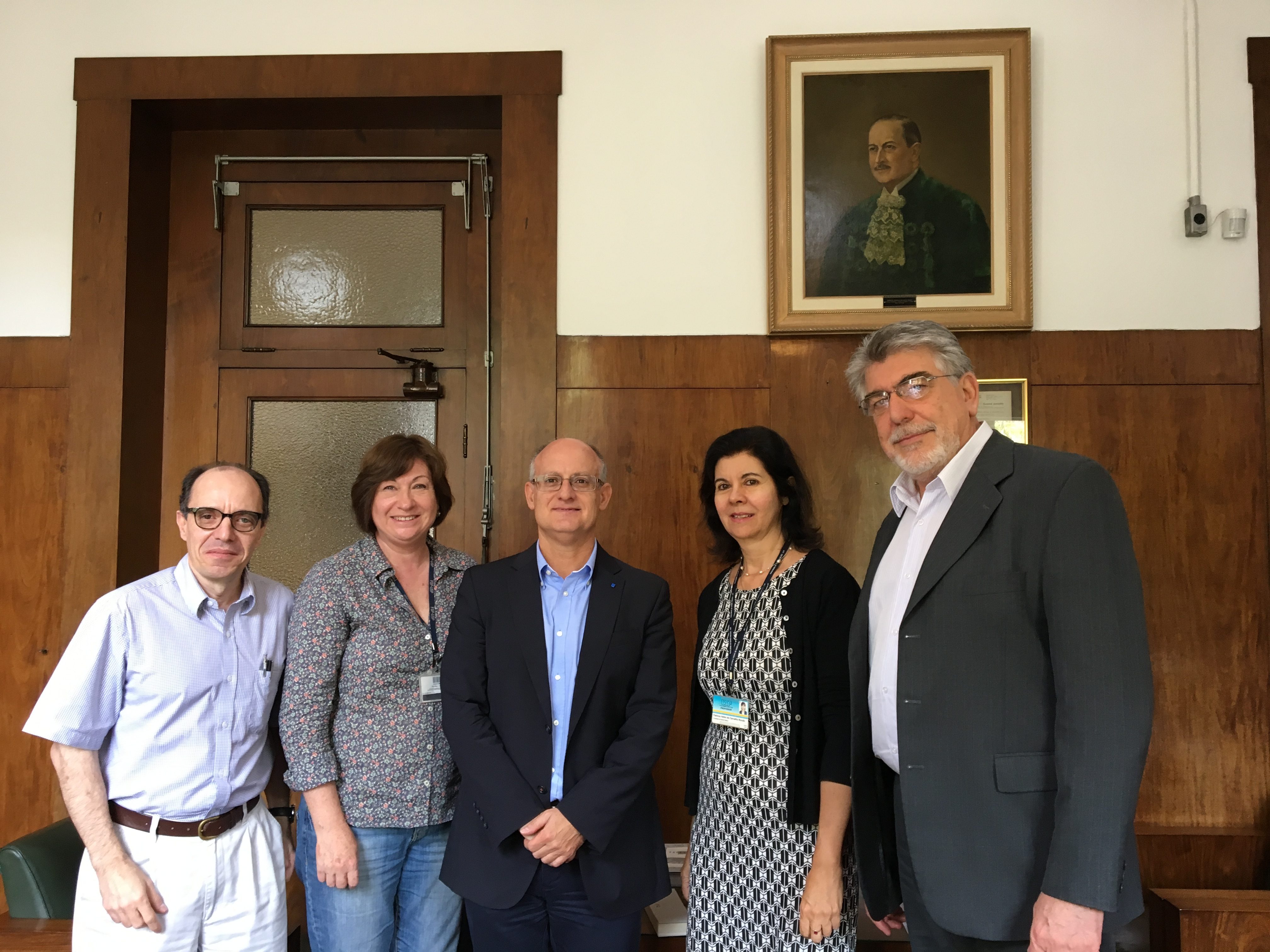 - Micol junto al decano de la Facultad de Salud Pública de la Universidad de Sao Paulo (el de la derecha, Prof. Victor Wünsch Filho) y otros miembros del equipo de dirección de la Facultad.