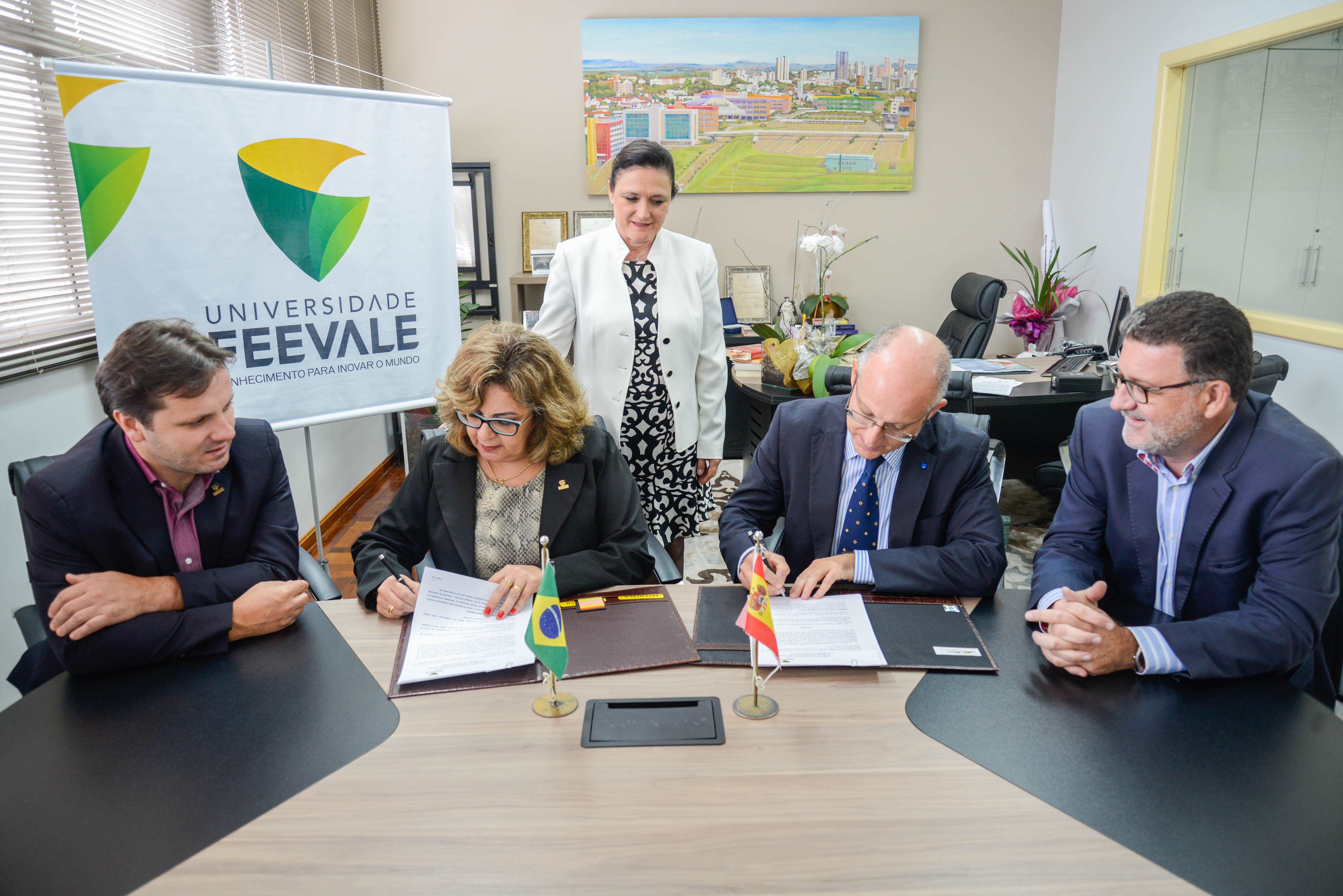 - Micol firmando los convenios junto a la Rectora de la Universidad de FEEVALE, la Profa. Inajara Vargas, el Vicerrector de Investigación, Prof. João Alcione Sganderla (izqda.), el Vicerrector de Innovación, Prof. Cleber Cristiano Prodanov (drcha.) y la Directora de Relaciones Internacionales, Profa. Paula Casari (centro).