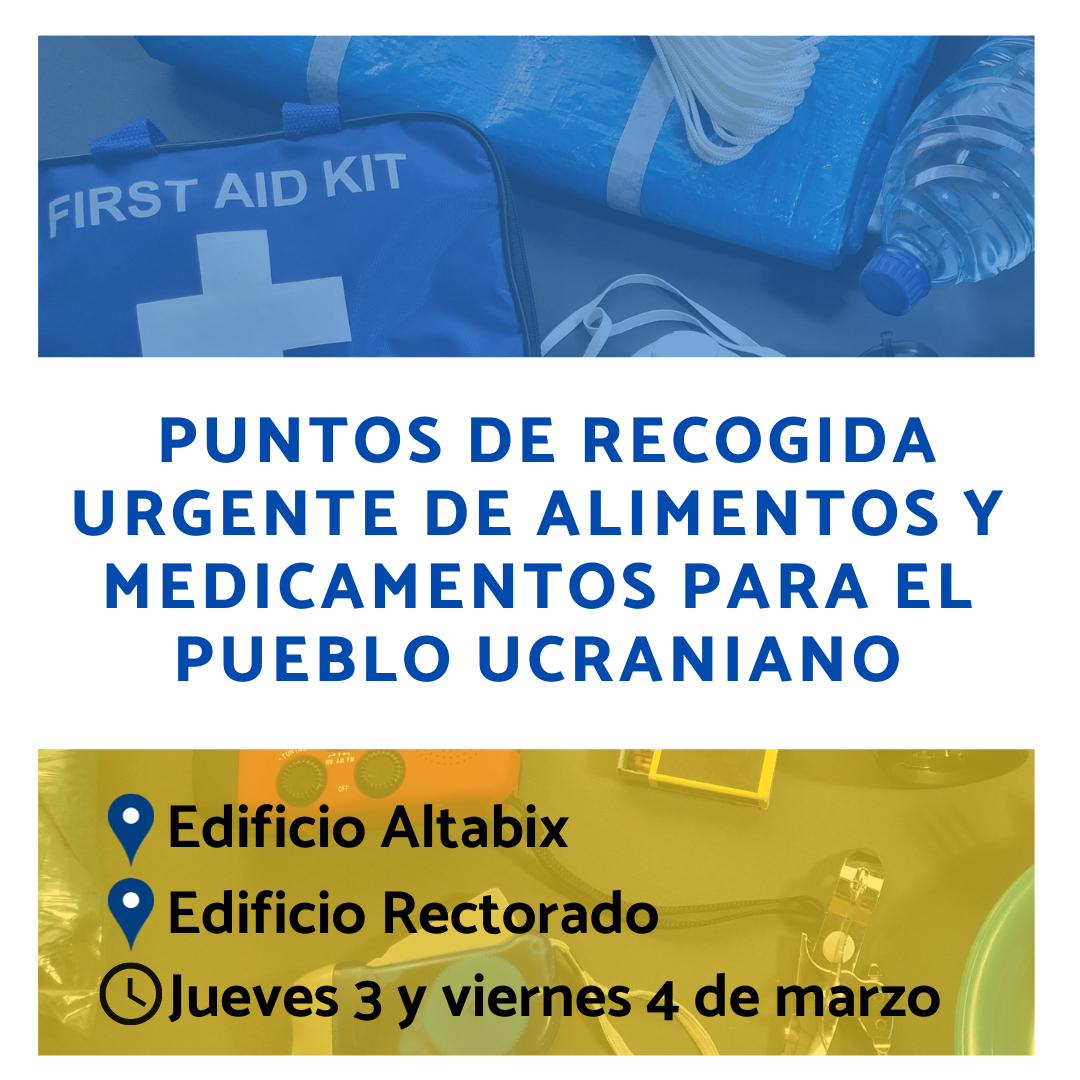 (02/03/2022) La Universidad Miguel Hernández (UMH) de Elche, habilita dos puntos de recogida urgente de medicamentos, material sanitario y productos de primera necesidad para el pueblo ucraniano. Estos puntos estarán habilitados este jueves y viernes en el Edificio Altabix y el Edificio Rectorado.