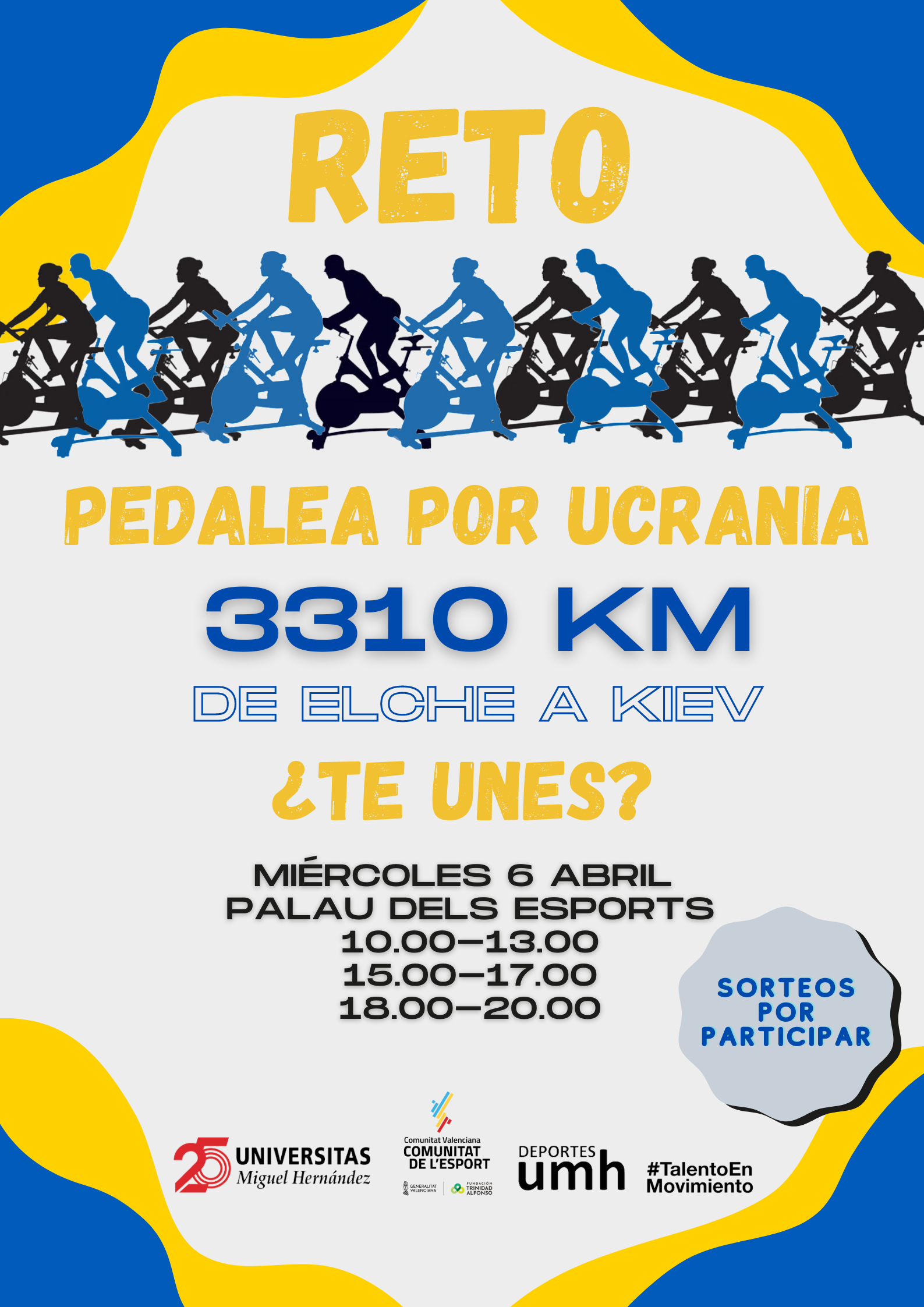 Con motivo del Dia de l’Esport y en apoyo a la población ucraniana ante el conflicto bélico que le asola, el Vicerrectorado de Inclusión, Sostenibilidad y Deportes y la Oficina de Campus Saludables y Deportes de la UMH, con la Fundación Trinidad Alfonso y el Vicerrectorado de Relaciones Internacionales de la UMH, ha organizado el Reto “Pedalea por Ucrania” que se llevará a cabo el miércoles día 6 abril a las puertas del Palau dels Esports del campus de Elche de la UMH.