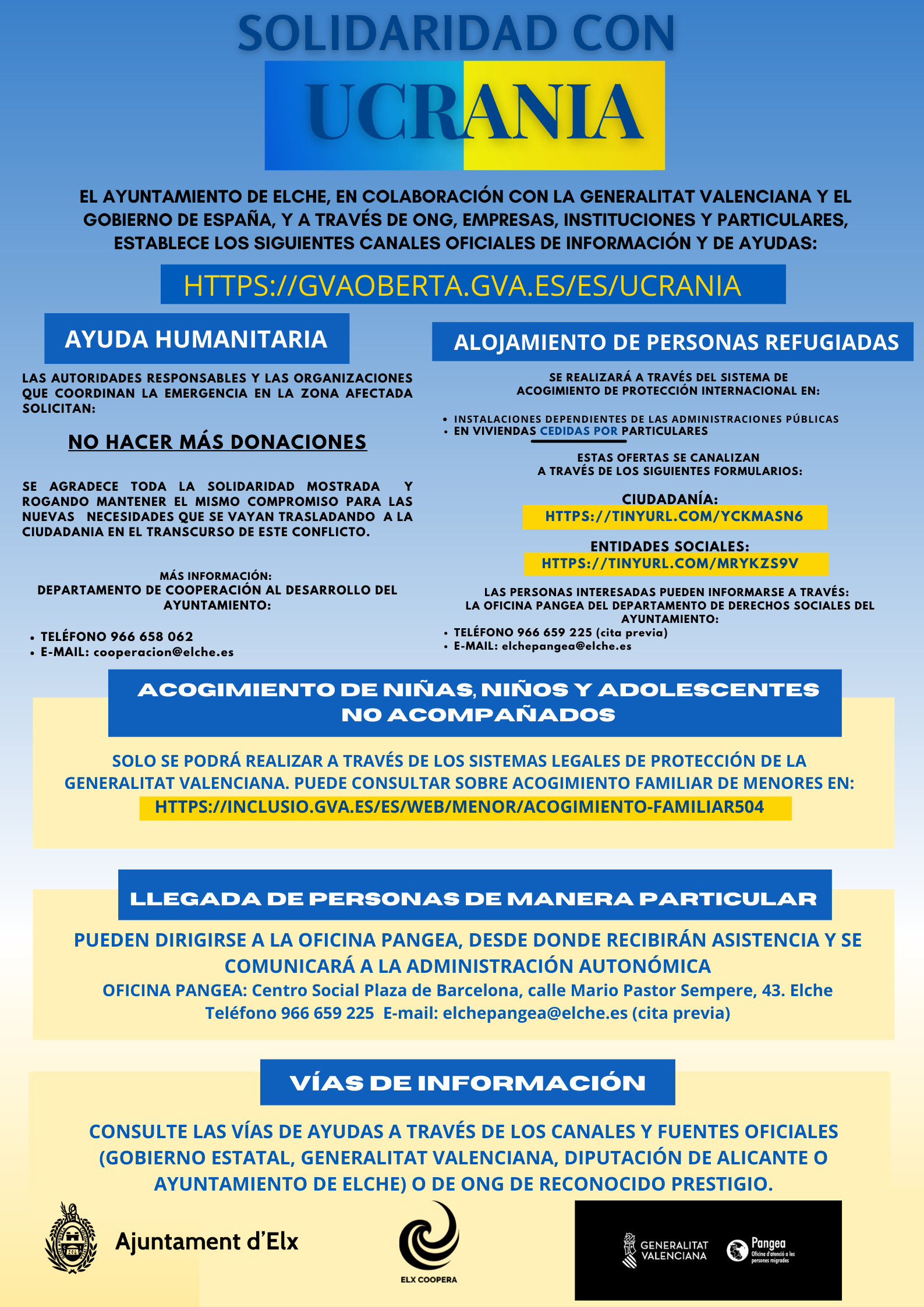 (24/03/2022): El Ayuntamiento de Elche traslada su agradecimiento a toda la ciudadanía ilicitana ante la inmensa ola de solidaridad en relación con la ayuda humanitaria a Ucrania. Por otro, informa sobre el mejor modo de canalizar la ayuda, de forma que los destinatarios puedan obtener el máximo aprovechamiento de la misma a través de la siguiente página web.