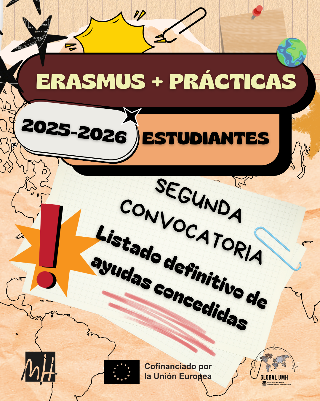 El Vicerrectorado de Internacionalización y Cooperación de la Universidad Miguel Hernández (UMH) de Elche publica el listado definitivo de ayudas concedidas de la 2.ª convocatoria del programa de movilidad internacional Erasmus+ Prácticas del curso académico 2025/2026.