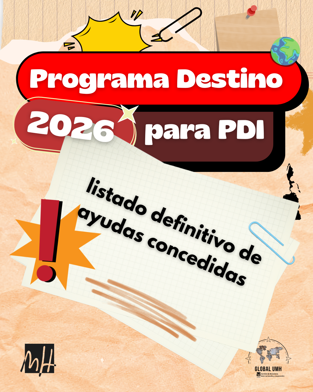 El Vicerrectorado de Internacionalización y Cooperación de la Universidad Miguel Hernández (UMH) de Elche publica el listado definitivo de ayudas concedidas del programa de ayudas de movilidad para actividades de internacionalización de la docencia– Programa DESTINO PDI-Docencia 2026.