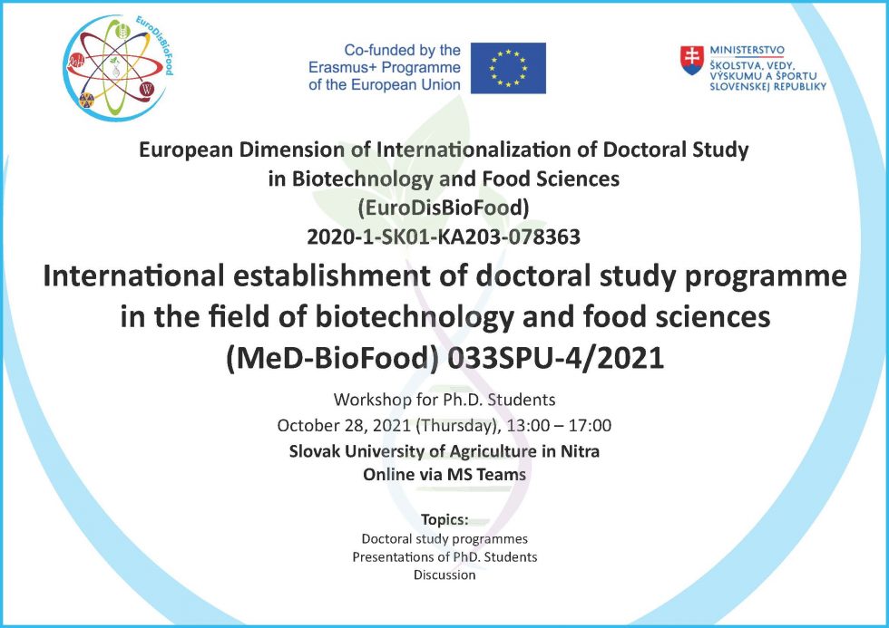 Projecte que consisteix a promoure la internacionalització d’estudis de doctorat en anglés, centrats en biotecnologia i ciència alimentària amb la fi estratègica de la fase preparatòria de la Doble Titulació del Programa de Doctorat en la Universitat Eslovaca d’Agricultura de Nitra i altres universitats estrangeres.