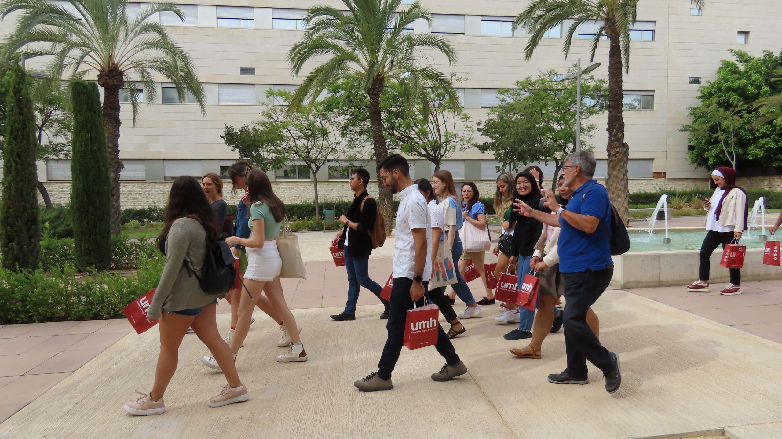The group, comprised of students from countries that include Brazil, United States, Philippines, Indonesia, and Jordan, toured the facilities where they are going to undergo their academic and training activities. Then, they visited the main buildings on the Elche Campus and its sporting facilities, libraries, green spaces, and cafeterias. In addition to this morning’s welcome, the students are going to take a guided tour and see the city of Elche’s central and interesting locations, including the Palm Grove Forest and the historical city center.