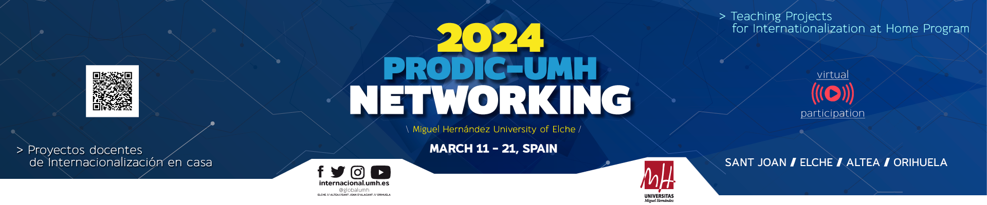 It is with great pleasure to announce the 2024 PRODIC-UMH Networking sessions, which is taking place March 11-21, 2024. During this event, faculty members from the UMH and external institutions alike are presenting the conclusions from their 2022 PRODIC projects. For the UMH, welcoming individuals from foreign universities affords opportunities to promote our university, as well as Elche, Spain, its surrounding area, and to learn about other internationalization experiences in teaching.