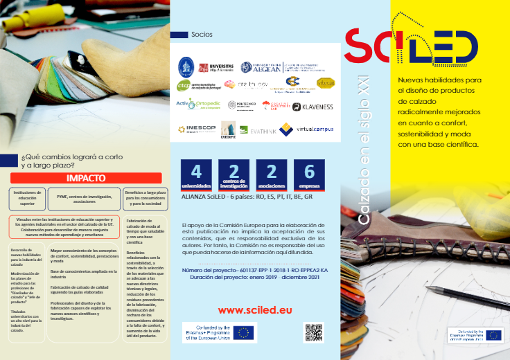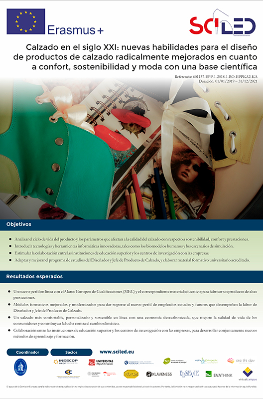 | DESCRIPCIÓN: El proyecto ERASMUS+ SciLED busca dotar a los profesionales del diseño y responsables de producto con habilidades creativas e innovadoras, así como con conocimientos sólidos sobre los aspectos que determinan el confort y la sostenibilidad del calzado. |