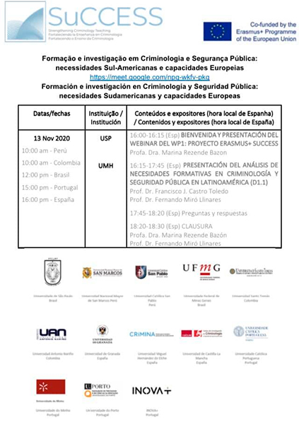 | DESCRIPCIÓN: SuCCESS tiene como objetivo fortalecer las capacidades y el conocimiento de profesores e investigadores en América del Sur para desarrollar y mejorar las ofertas de educación superior en las áreas de criminología y seguridad pública, mediante el intercambio de experiencias, conocimientos y habilidades de las universidades europeas (Portugal y España ) y Sudamérica (Brasil, Colombia, Perú). |