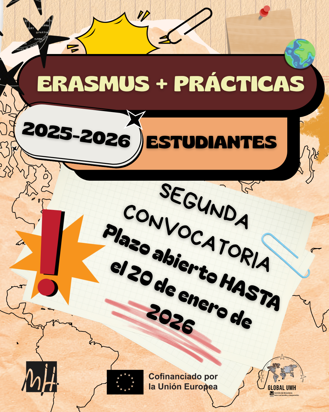 NUEVO (12/12/2025): El Vicerrectorado de Internacionalización y Cooperación de la Universidad Miguel Hernández (UMH) de Elche publica la 2ª convocatoria Erasmus+ Prácticas para el curso 2025/2026. Los interesados deberán realizar la solicitud de manera online y presentarla, junto al resto de la documentación, a través de la sede electrónica. Una vez formalizada la solicitud, deberá pinchar sobre el botón “registrar solicitud” que le llevará directamente a la presentación de la documentación por sede electrónica.